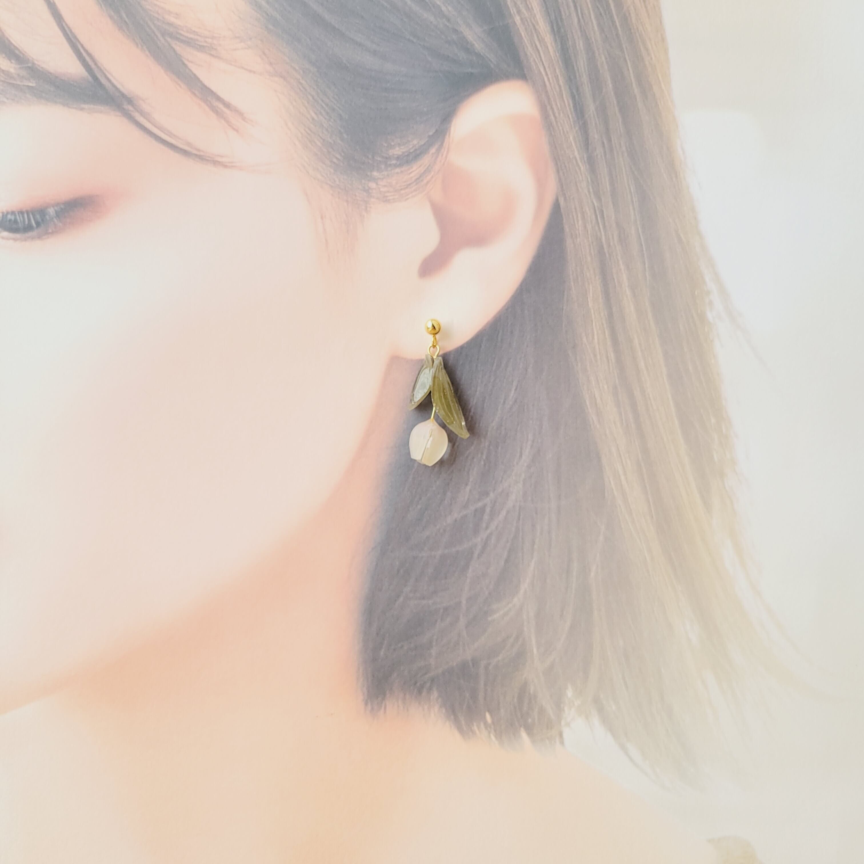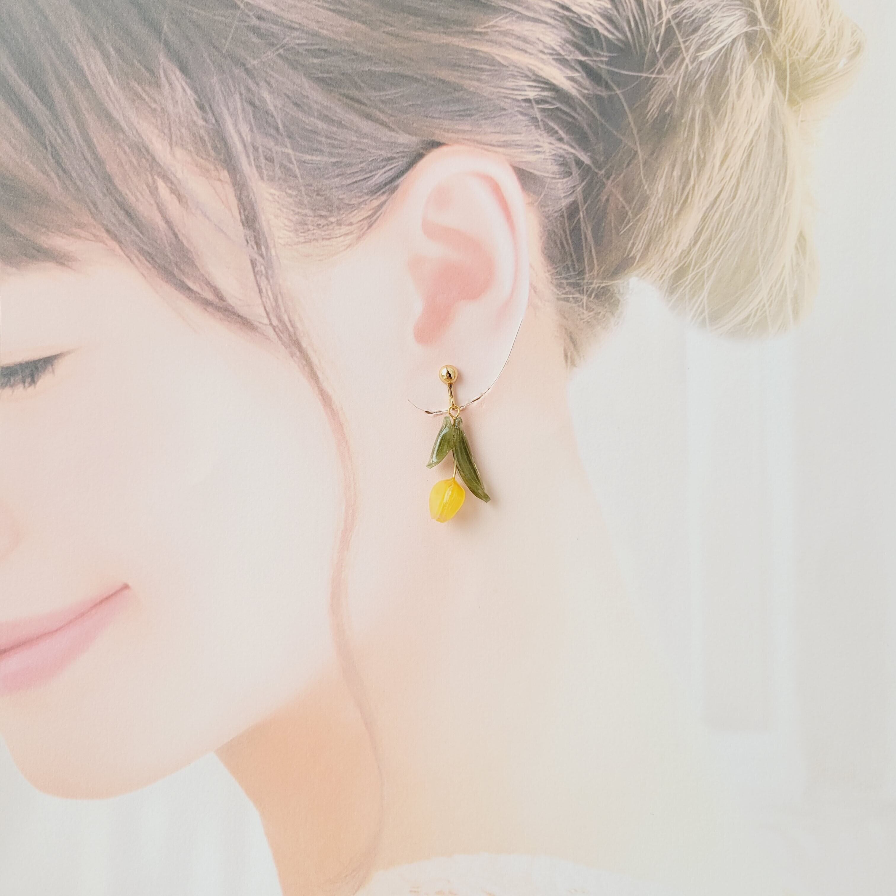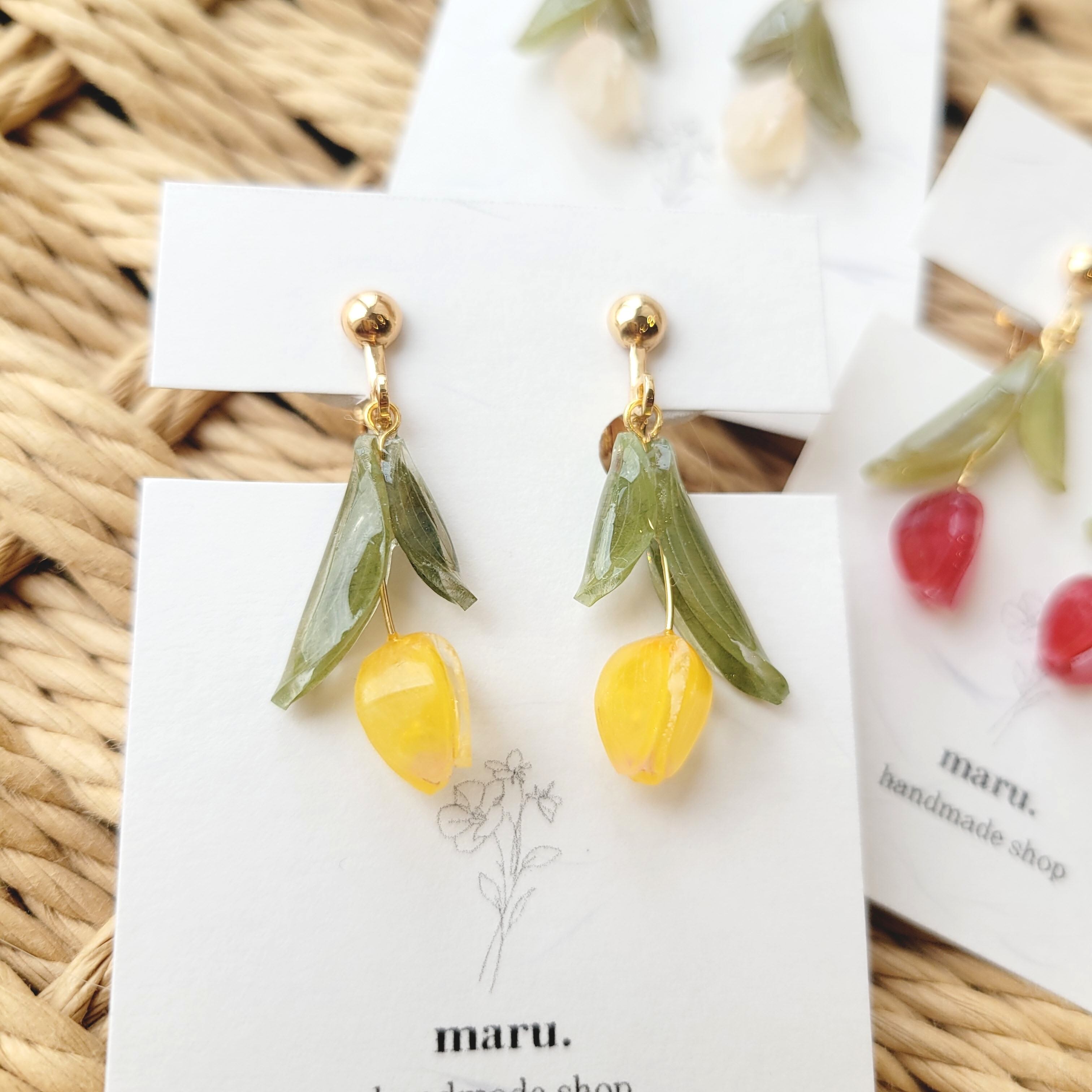 春にピッタリなチューリップのイヤリングです。耳からゆらゆらと揺れる一輪のチューリップが、春のお出かけを彩ります♪︎